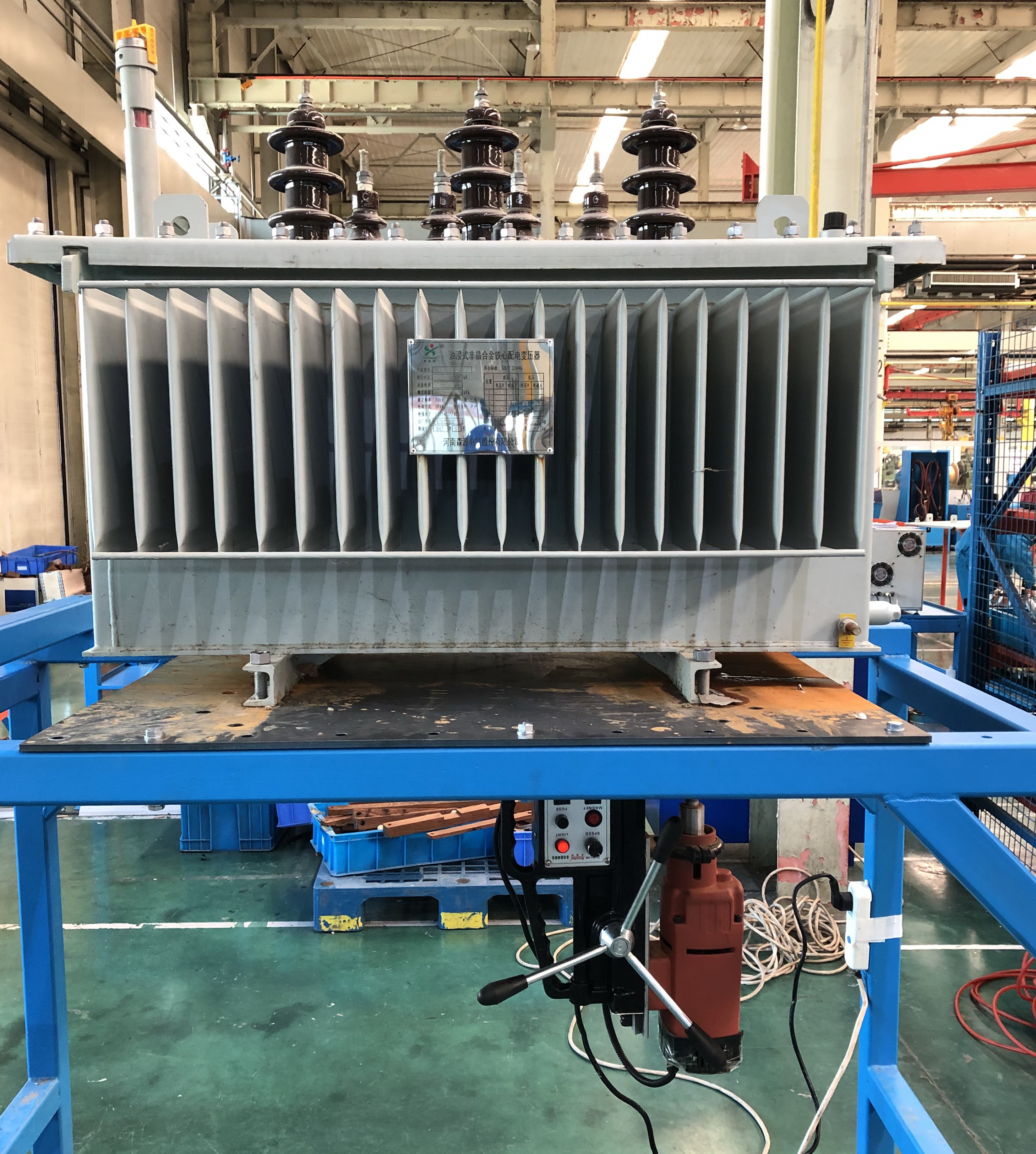 以前,当用户要求的变压器地脚孔距与备库非晶合金变压器不一致时,需要经过抽油-吊芯-拆附件后才能进行钻孔,之后还要进行重新装配-注油—抽真空-静止与试验等一系列工序,改装过程极其繁琐,不仅浪费大量劳力,还影响产品交货期。针对此问题成装车间主任带领车间骨干员工集思广益、群策群力设计地脚孔拆改专用工装。该工装分为支撑架与支撑钢板两部分,在支撑钢板上可实现后续所有非晶变压器地脚孔的便捷调整,人站立在支撑架下面使用磁力钻即能进行精确的测量与孔距调整,避免了对整个变压器器身的拆改装配,在降低了员工劳动强度与工作量的同时,还缩短了产品交货期。